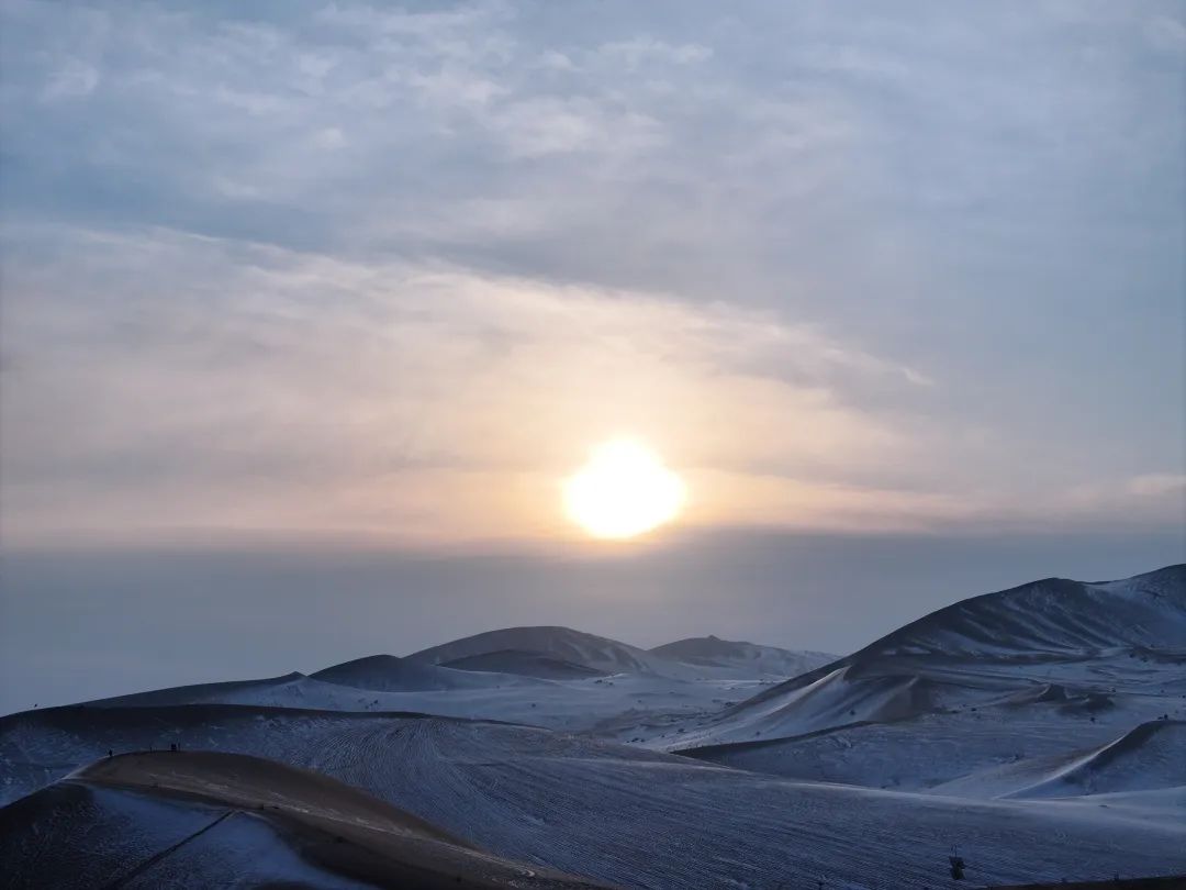 清晨晨曦划破天际,连绵起伏的鸣沙山在白雪的覆盖下,犹如一条条银龙在沙漠中蜿蜒盘踞,雪面泛起的银光与沙脊勾勒出的金色轮廓相互交织,在广袤的沙漠中绘就了一幅如梦如幻的画卷。游客们沿着登山梯攀登而上,抵达山顶后,银装素裹的月牙泉映入眼帘,宛如一颗美玉镶嵌在白雪皑皑的沙海之中。